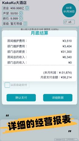 游戏内包含了直观而详细的酒店入住、经营报表,玩家需要根据经营报表去实时调整酒店经营策略!