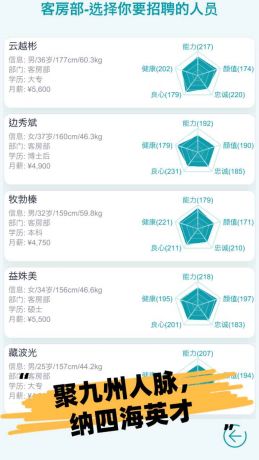 游戏内部员工设计了能力、忠诚、颜值、健康、年龄、身高体重等属性;不同的数值会触发不同事件,