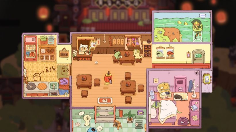 在人类世界位于海边的小镇,这个地方是人类和神仙鬼怪交界之处,每到黄昏之际人类开始进入休息的时候就是妖怪们开始活跃的时候。小白狗在白天驻守的小寺庙到了晚上就成为妖怪经常光顾的大酒店。
