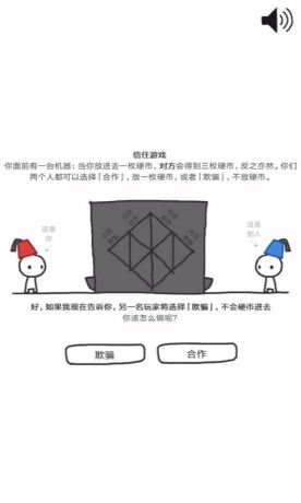 这是一款教你做人的游戏!信任自古都是一个引人思考的话题,你想被人信任吗?你想体验一个关于信任的游戏吗?不管你想不想,这游戏看得我脑壳疼! 这是一个以经济学博弈论为理论基础,用生动形象的动画,演示了信任的进化的小游戏。 你猜,我这个硬币,会不会给你呀?你的每一次选择都会影响后续的发展,请做出正确的判断! 通过一个欺诈和合作的博弈小游戏,得出每个角色的受益情况,给我们全面分析了这些不同性格的人。在当今社会的生存状况下,做人既不能太友善,也不能太奸诈,“复读机”性格更能够适应人类社会。 最后,用充分的数据证明了三个观点: